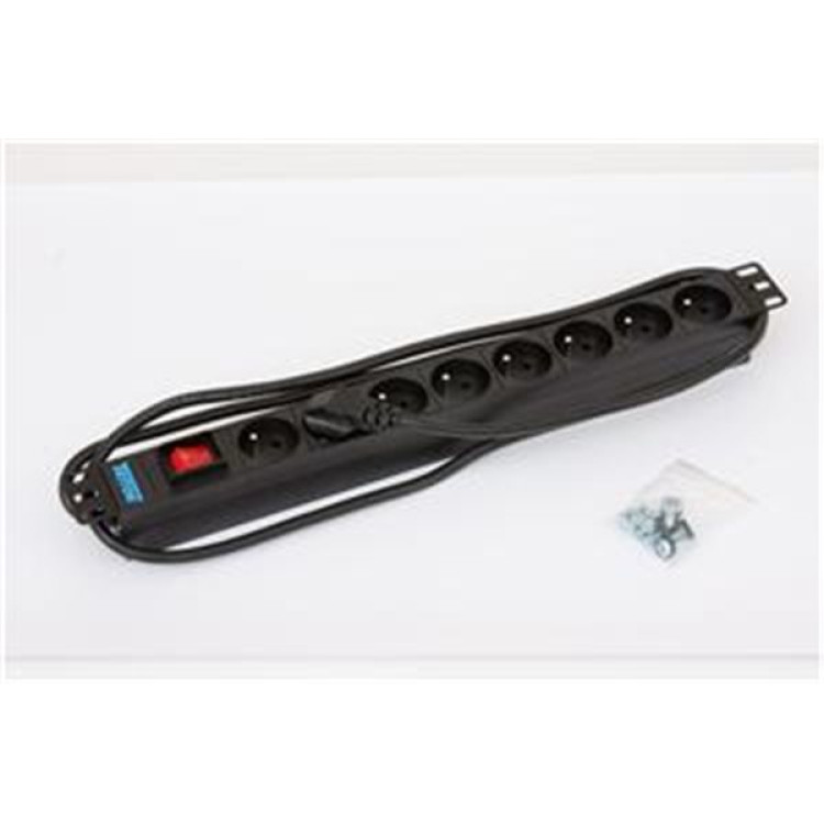 19" rozvodný panel 1U, 8x zásuvka podle ČSN, max 16A, kabel 3x1,5mm, 2m + zástrčka univezál CZ-DE max. 16A, podsvícený vypínač, RAL 9005;