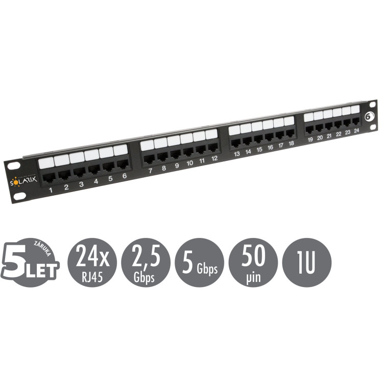 Patch panel Solarix s označením SX24-6-UTP-BK je vysoce kvalitní panel kategorie 6, který splňuje požadavky na komponenty této kategorie definované ve standardech ANSI/TIA 568, ISO/IEC 11801 a EN 50173 pro kategorii 6 a třídu vedení Class E, včetně všech nejnovějších dodatků. Tento panel je testován pro šířku pásma až do 350 MHz, čímž převyšuje požadavky specifikované pro kategorii 6. Panel je dodáván ve verzi s 24 porty RJ45 a je osazen moduly s duální IDC svorkovnicí 110/Krone. Kontakty jsou na svorkovnici z důvodu snadného zakončení datového kabelu označeny jednotlivými barvami podle typu zapojení a to buď podle standardu T568A nebo T568B. Panel SX24-6-UTP-BK patří do skupiny komponentů systému Solarix - kategorie 6 a stejně jako všechny komponenty v této produktové řadě je vyroben tak, aby poskytoval maximální životnost, vynikající výkon, spolehlivost a především jednoduchou instalaci. Barva Solarix patch panelu kategorie 6 je černá; velikost v datovém rozvaděči je 1U.