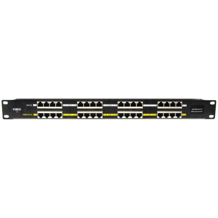 Stíněný panel integrující 16 pasivních POE injektorů vhodný pro napájení až šestnácti aktivních prvků v provedení do 19" racku.