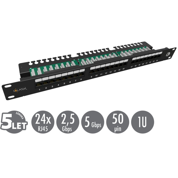 Patch panel Solarix s označením SX24L-5E-UTP-BK-N je panel osazený 24 porty RJ45, jehož součástí je vyvazovací lišta sloužící k přehlednému vyvázání a pevnému uchycení kabelů přímo k tělu panelu. Instalační kabel se zakončuje do duální IDC svorkovnice typu 110/Krone. Svorkovnice je z důvodu snadného zakončení kabelu označena podle standardu T568A i T568B. Stejně jako všechny ostatní komponenty strukturované kabeláže Solarix je tento panel vyroben tak, aby zaručoval maximální životnost, velmi dobrou funkčnost a především vysokou spolehlivost. Tento patch panel Solarix splňuje požadavky na komponenty kategorie 5E a třídy vedení Class D, které jsou definovány ve standardech ANSI/TIA 568, ISO/IEC 11801 a EN 50173, a to včetně všech nejnovějších dodatků. Barva patch panelu je černá; velikost v datovém rozvaděči je 1U. Součástí balení je 4x M6 montážní sada, a 24x vyvazovací pásek. Tento nový patch panel Solarix nahrazuje panel s označením SX24L-5E-UTP-BK.