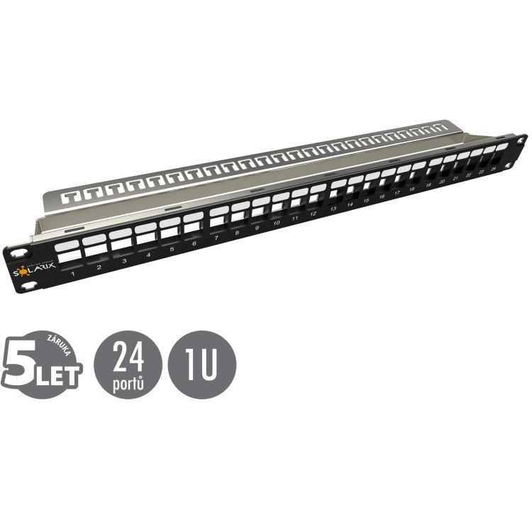 Patch panel Solarix s označením SX24M-0-STP-BK-UNI-N je univerzální neosazený patch panel, který je určený pro 24 stíněných i nestíněných keystonů Solarix SXKJ-xx-yyy-BK-SA a SXKJ-xx-yyy-BK-NA. Modulární provedení patch panelu umožňuje pohodlnou instalaci a díky vyvazovací liště, která je součástí dodávky panelu, i přehledné vyvázání a pevné uchycení datového kabelu přímo k tělu panelu. Tento patch panel je vybaven zemnícím drátem, který umožňuje jeho propojení se zemněním rozvaděče. Barva patch panelu je černá, vyvazovací lišty stříbrná, velikost v datovém rozvaděči je 1U. V případě potřeby je možné zaslepit volné porty panelu záslepkou SXKJ-0-BK. Rozměry otvorů pro keystone jsou u tohoto modulárního panelu Solarix 19,5±0,1 mm x 14,8±0,1mm (tj. dle ČSN EN 60603-7). Součástí balení je 4x M6 montážní sada, 24x vyvazovací pásek a 1x zemnící drát. Tento patch panel má čelo vyrobeno z vysokopevnostního plastu, které je nalisováno na kovovou kostru panelu.