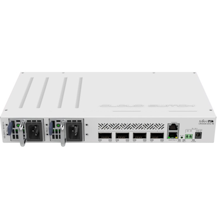 Optický Cloud Router Switch CRS504-4XQ-IN je vhodné 19" rackmount řešení pro vstup do 100 Gbps sítí a jako malý centrální optický switch, který nabízí 4x QSFP28 s rychlostí 100 Gbps, 1x ethernetový port s podporou napájení pasivního PoE a konzolový RJ45 port. Switch lze napájet jak přes dva redundantní Hot-swap zdroje, DC konektor / DC svorkovnici (36 - 57V DC), tak přes ethernetový port podporující pasivní PoE s napětím 43 - 57V DC. Maximální spotřeba zařízení je 41W.