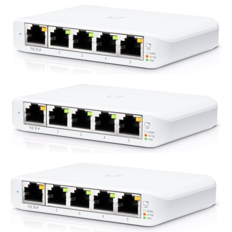 USW-Flex-Mini je maličký 5-portový Gigabitový switch se správou přes UniFi Network application od Ubiquiti v desktop provedení s prvním portem podporujícím PoE In.