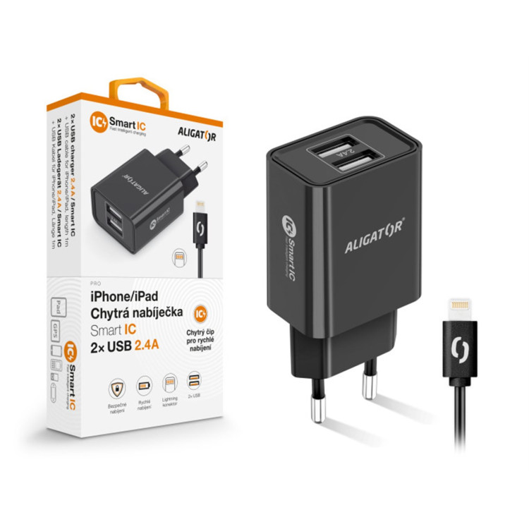 Chytrá síťová nabíječka ALIGATOR 2.4A, 2xUSB, smart IC, černá, kabel pro iPhone/iPad 2A