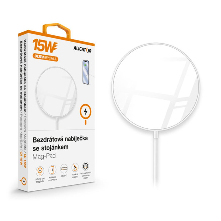 Kompaktní zpracování v elegantní bílé barvě se zářivě lesklým povrchem, praktickým stojánkem a 1m dlouhým přívodním USB-C kabelem, to je bezdrátová nabíječka Aligator Mag-Pad. Součástí balení je také feromagnetická samolepka, díky které můžete rozšířit kompatibilitu u pouzder, které tuto technologii nepodporují.