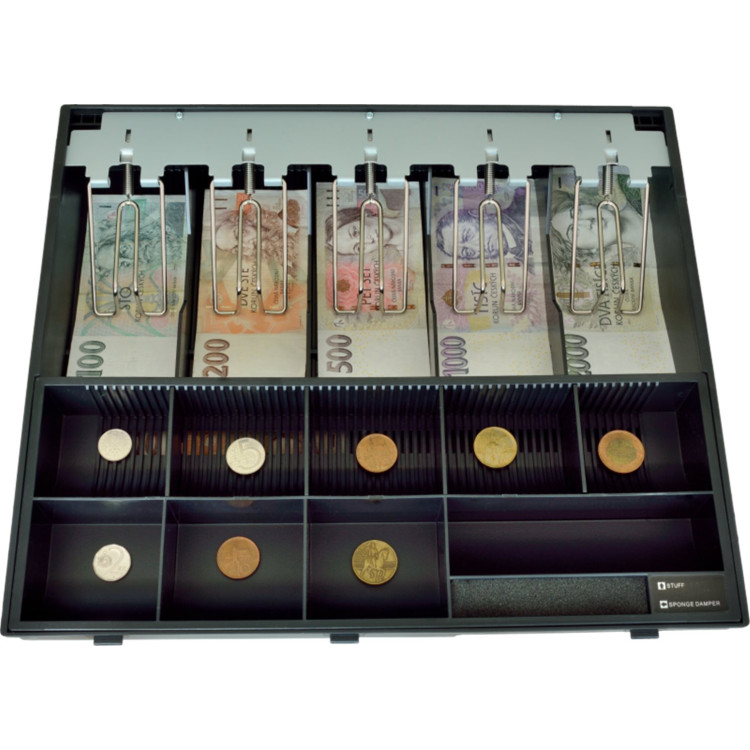 Dostatečně široký pořadač pro pohodlné umístění 5 druhů bankovek vedle sebe. Obsahuje vyjímatelný mincovník a pořadač bankovek s libovolně nastavitelnými přihrádkami. Pořadač disponuje kovovými držáky bankovek a je možné jej doplnit o uzamykatelný kryt EPP12050.
