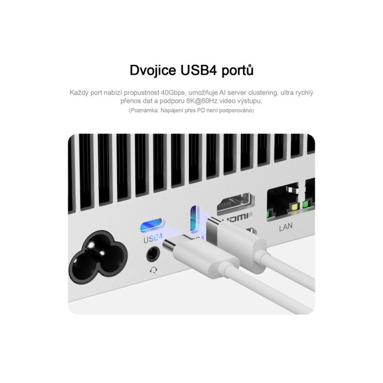 Tento model obsahuje 2x USB 3.2 porty (10Gbps), 2x USB-C (USB4 40Gbps) a 1x USB-C 10Gbps.