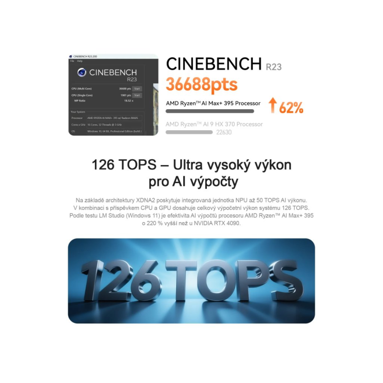 Procesor nejnovější generace AMD Ryzen™ AI Max+ 395 s podporou AI pomocí Neurální Procesorové Jednotky v nejvyspělejší verzi XDNA 2 s celkovým výkonem 128 TOPS, vyznačuje se taktéž nejvyšším výkonem spolu s grafickým 40 jádrovým čipem AMD Radeon 8060S s frekvencí 2.9GHz založený na nejnovější architektuře RDNA3.5. Procesor vyroben vyspělou 4 nm technologií poslední generace Zen 5 dosahuje taktu až 5.1 GHz, obsahuje 16 jader a 32 vláken. Podporuje až čtyři monitory současně. Spotřeba energie (TDP) je pouze 55W, v turbo režimu 120W.