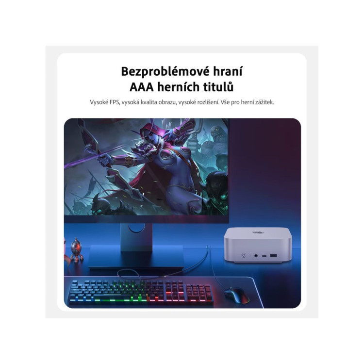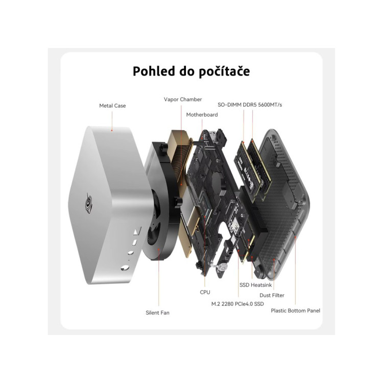 Velikost tohoto mini počítače je 135 x 135 x 44,7 mm (bez gumových nožiček) s váhou okolo 700 gramů. Tento mini počítač je kompaktní a stylový. Nehledě kam jej umístíte, vždy designově zapadne.