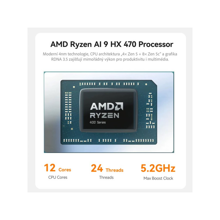 Procesor AMD Ryzen 9 HX 470 s podporou AI pomocí Neurální Procesorové Jednotky v nejvyspělejší verzi XDNA 2, vyznačuje se taktéž vysokým výkonem spolu s grafickým šestnáctijádrovým čipem AMD Radeon 890M s frekvencí 3.1GHz založený na nejnovější architektuře RDNA3.5. Procesor vyroben vyspělou 4 nm technologií poslední generace Zen 5 a Zen 5c dosahuje taktu až 5.2 GHz, obsahuje 12 jader a 24 vláken s L2+L3 Cache 36MB. Podporuje až tři monitory současně. Spotřeba energie (TDP) je pouze nevídaných 15-54W.
