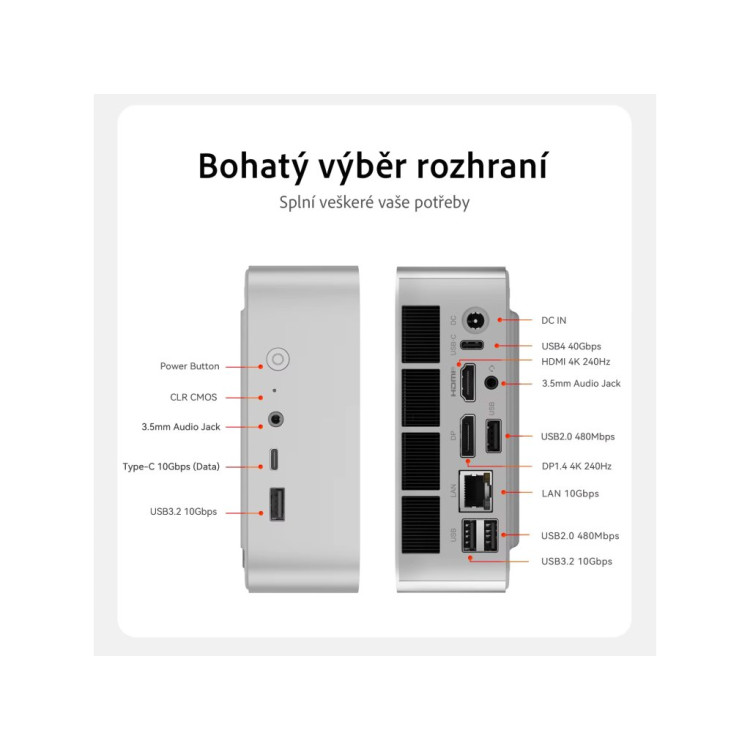 Tento model obsahuje 2x USB 3.2 porty (10Gbps), 2x USB 2.0 porty a 2x USB-C (z toho 1x USB4 40Gbps).