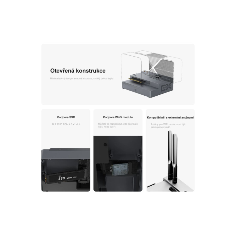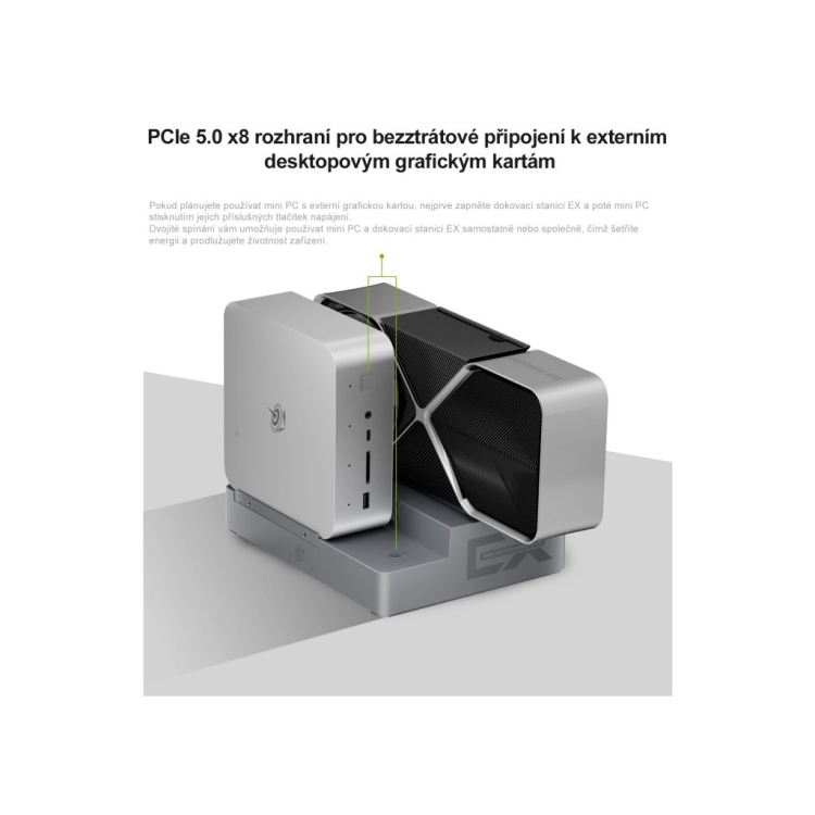 Pokud plánujete používat mini PC s desktopovou grafickou kartou, nejprve zapněte dokovací stanici EX a poté mini PC stisknutím příslušných tlačítek napájení. Konstrukce s dvojitým spínačem umožňuje používat mini PC a dokovací stanici EX samostatně nebo společně, což šetří energii a prodlužuje životnost produktů.
