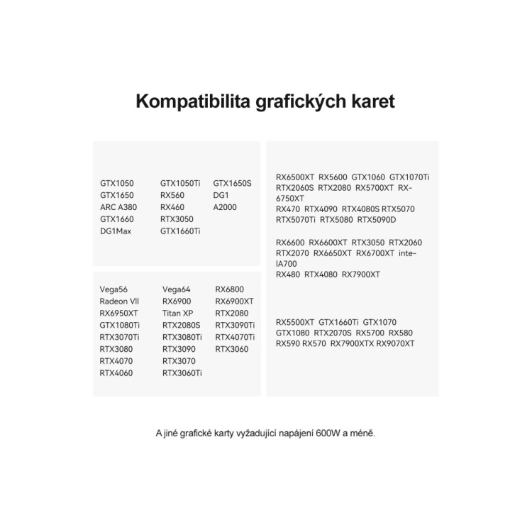 Dokovací stanice má dva 8pinové napájecí konektory. Pokud vaše grafická karta vyžaduje 3× 8pinový konektor, možná budete potřebovat kabelový adaptér z 8 pinu na dva 8piny. Pokud vaše grafická karta používá 16pinový port, možná budete potřebovat adaptér z 2×8 pinu na 16pin.