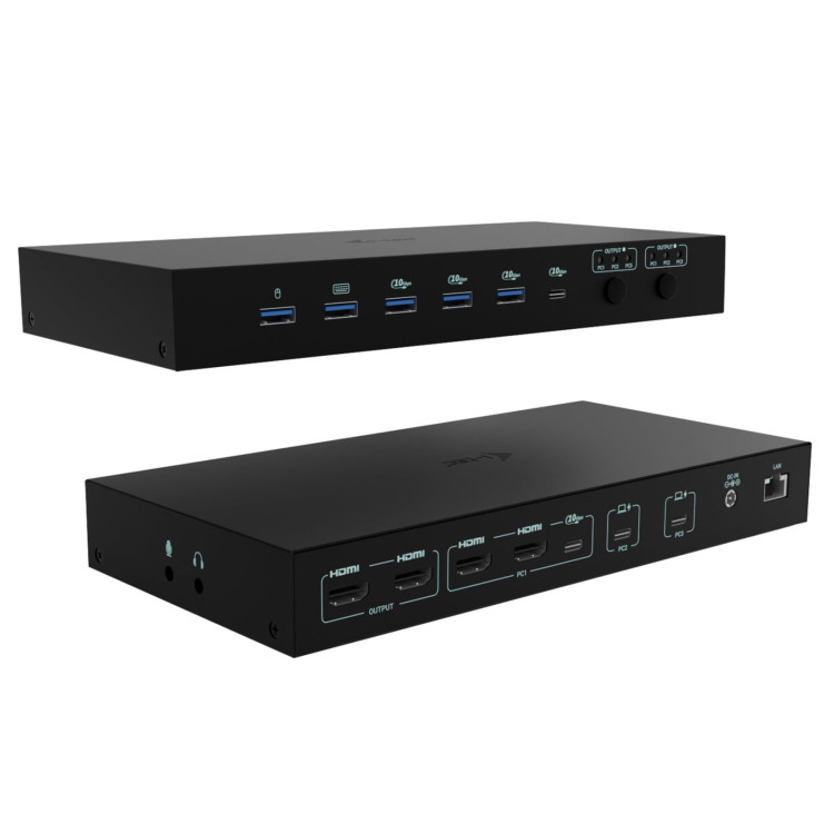Tato vysoce výkonná dokovací stanice umožňuje současné připojení až tří hostitelských zařízení – jednoho PC nebo herní konzole a dvou notebooků či tabletů. Je plně kompatibilní se zařízeními s porty USB-C, USB4 nebo Thunderbolt 3/4/5. Počítače nebo konzole lze připojit přes HDMI a USB.