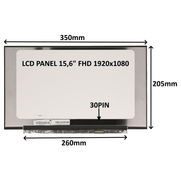 Úhlopříčka: 15,6" Rozlišení: 1920x1080 FHD Konektor: 30 PIN Typ podsvícení: LED Povrch LCD panelu: MATNÝ Technologie LCD panelu: IPS Rozměry: Šířka: 350 mm Výška: 205 mm Délka invertoru: 260 mm Způsob uchycení LCD panelu: bez úchytů - lepení k LCD krytu Záruka: 24 měsíců i na vadné pixely