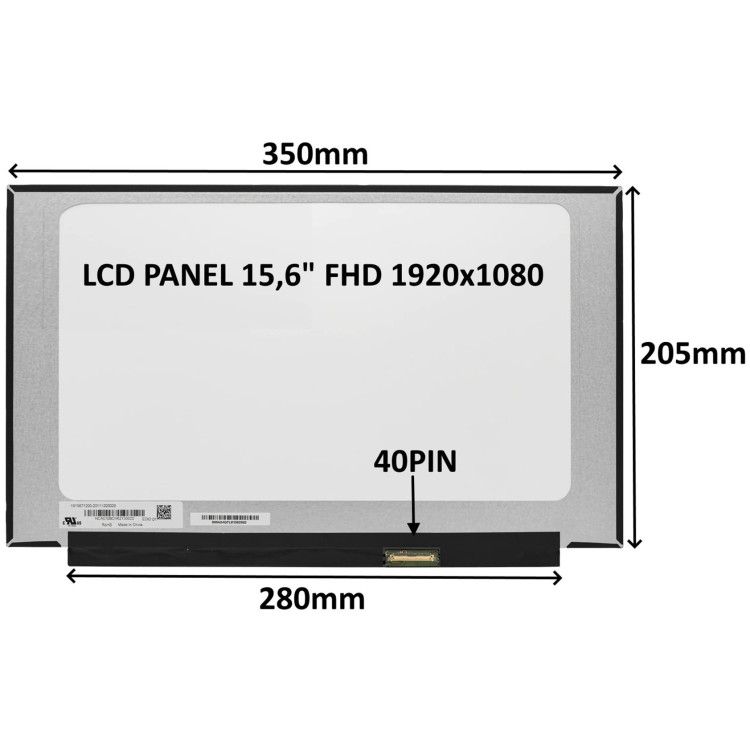 Úhlopříčka: 15,6" Rozlišení: 1920x1080 FHD Konektor: 40 PIN Typ podsvícení: LED Povrch LCD panelu: MATNÝ Technologie LCD panelu: IPS Rozměry: Šířka: 350 mm Výška: 205 mm Délka invertoru: 280 mm Způsob uchycení LCD panelu: bez úchytů - lepení k LCD krytu Záruka: 24 měsíců i na vadné pixely